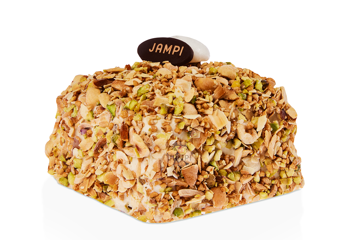 Crème glacée vanille bourbon 57%, mélange fruits à coque 22% (noisettes, amandes, pistaches), sauce caramel 8%, glaçage 7%, meringue 6%, carré de chocolat.