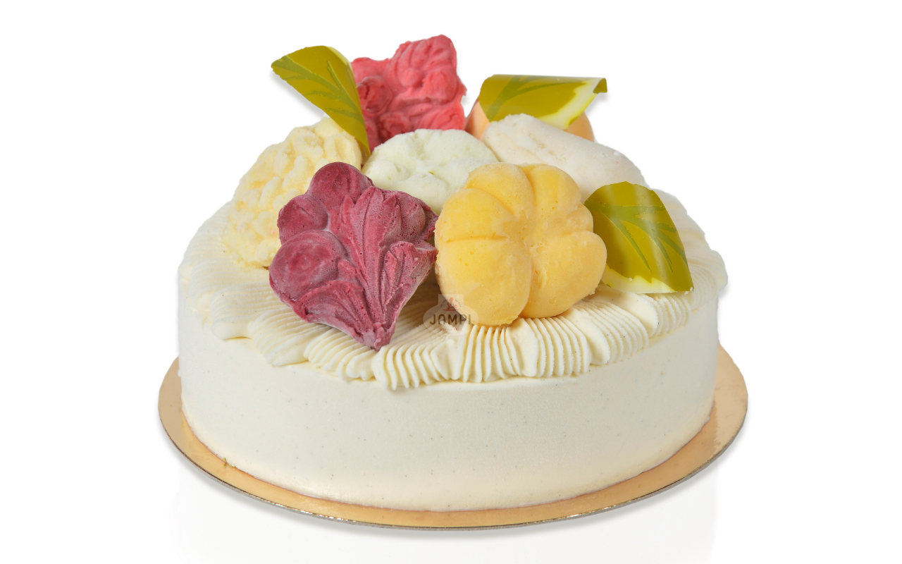 Crème glacée vanille bourbon 40%, sorbet fraise 20%, génoise 13%, assortiment de sorbets 25% (cassis, framboise, mangue, pomme verte, poire)